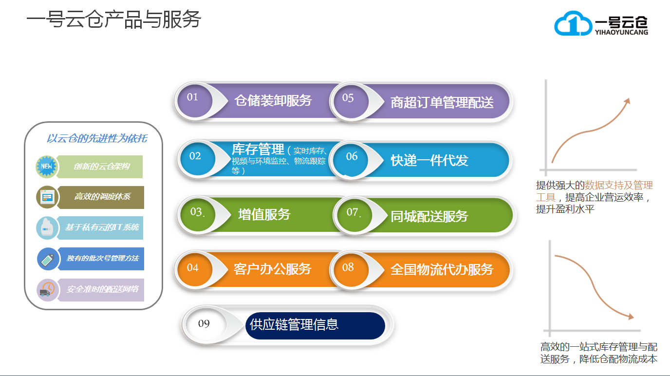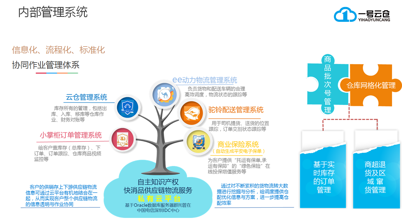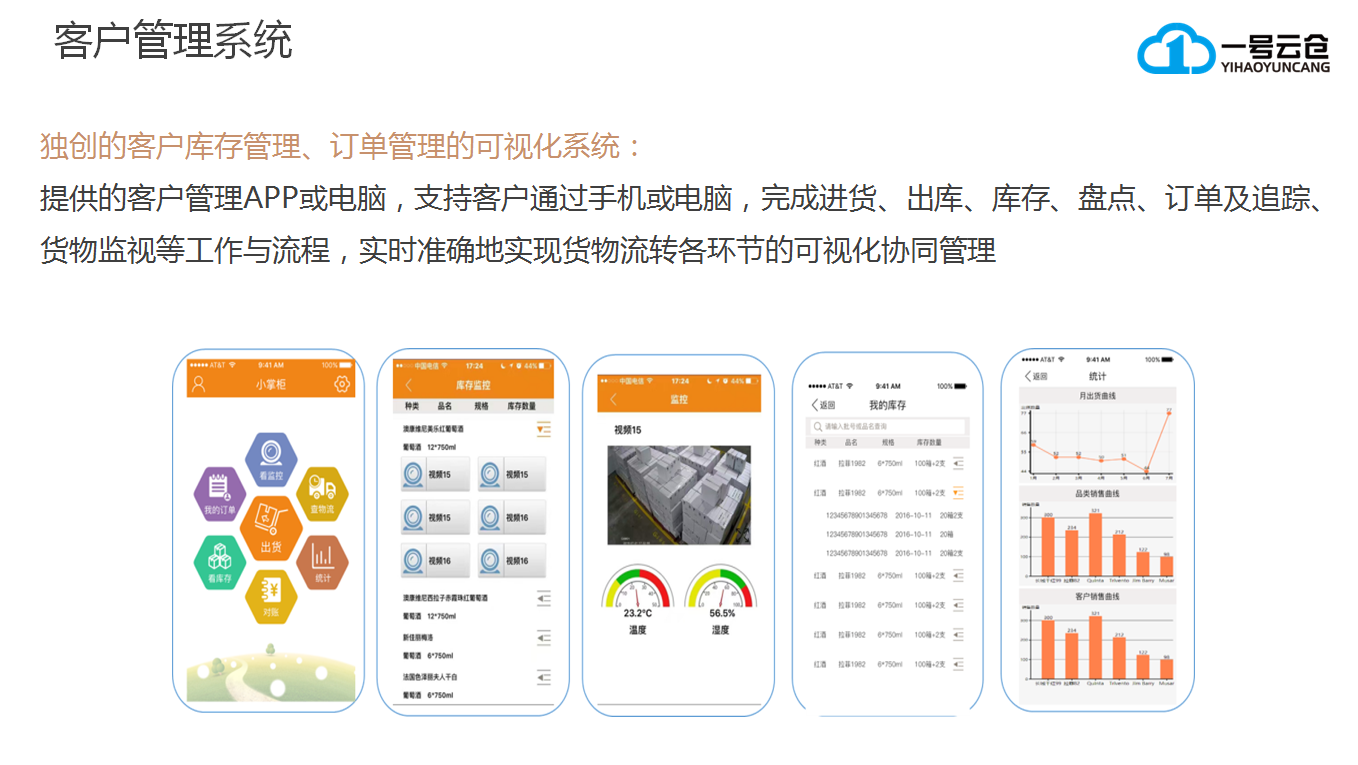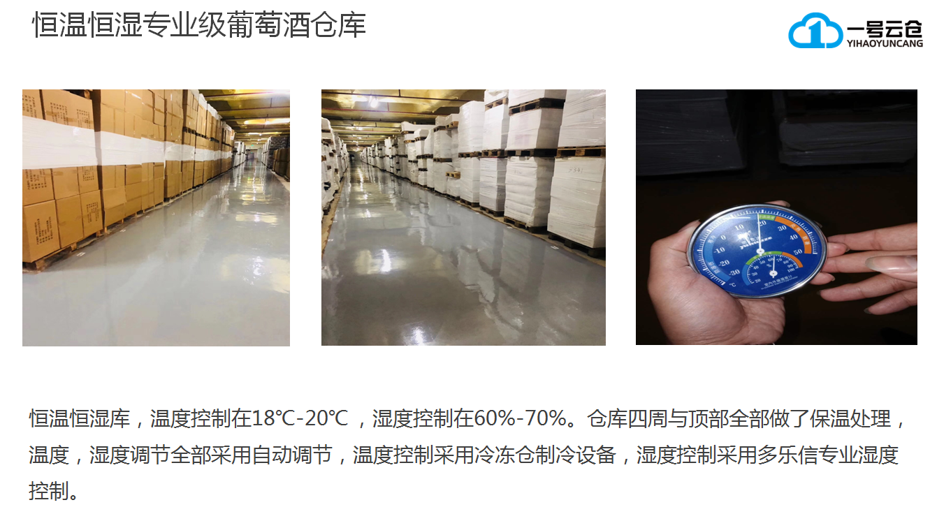 深圳市一号云仓储运有限公司成立2015年,专注于酒水类供应链仓储配送服务,目前是广东省酒类行业协会企业会员单位,深圳酒类行业协会理事单位,深圳葡萄酒行业协会副会长单位,公司位于深圳市龙岗区平湖街道山厦大厦,目前拥有员工60余人,管理团队有着30多年的仓储管理经验,有着10多年的酒水专业仓储管理经验,已经为1000多家客户提供了全托管式的服务。公司现有深圳市平湖总仓、观澜仓、宝安仓、广州仓、武汉仓、成都仓;在1-2年内完成全国一线城市云仓布局。仓库面积达50万平方米以上。目前恒温恒湿专业仓库80000平方米,常温恒湿干货仓55000平方米、恒温恒湿仓20000平方米、增值服务及电商打包仓2000平方米及进口食品商检备案仓3000平方米。可以为客户提供货物存储,同城配送,全国各地干线物流,快递一件代发,仓内加工,酒易贷仓单质押,各种包装材料及配套器具一站式采购等一系列的服务。公司自主研发的小掌柜(移动客户端),大掌柜(PC客户端),陆联电仓(仓内WMS),为客户提供在线实时库存查询,货物及仓内作业环境过程的实时视频查看,在线下单,以及下单后物流快递轨迹的跟踪。一站式解决了客户除采购,销售外的其他服务。为客户节省30%以上的仓储物流综合成本。